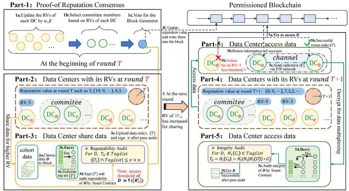 Data sharing is vital to breaking data silos and maximizing information value. However, practical implementations often rely on cloud servers, raising trust concerns that prevent Data Centers (DCs) from sharing sensitive data. Motivated by the need to ensure both the quality and quantity of shared data, we proposed a reputation-driven, auditable data-sharing model that uses blockchain to enable secure, distributed sharing. Our model faces two primary challenges: (1) ensuring data quality in distributed settings, where existing cloud-based audit schemes requiring high computational resources are unsuitable, and (2) promoting active sharing of scarce data, where current incentive mechanisms fail to encourage proactive participation. To address these, we introduce the Secure Auditable Sharing Protocol (SASP) and the fair Reputation-driven Proactive Sharing Mechanism (RPSM). SASP enhances ElGamal encryption and integrates efficient hashing techniques for privacy-preserving audits of ciphertext integrity and deduplication without relying on costly bilinear mappings. RPSM tackles the challenge of selfish DCs by incorporating a committee mechanism and consensus algorithm, ensuring fair incentives to encourage active participation. Our implementation and real-world case study demonstrate that the proposed model effectively guarantees the quality and quantity of shared data, offering a novel solution to the data silo problem in distributed architectures.